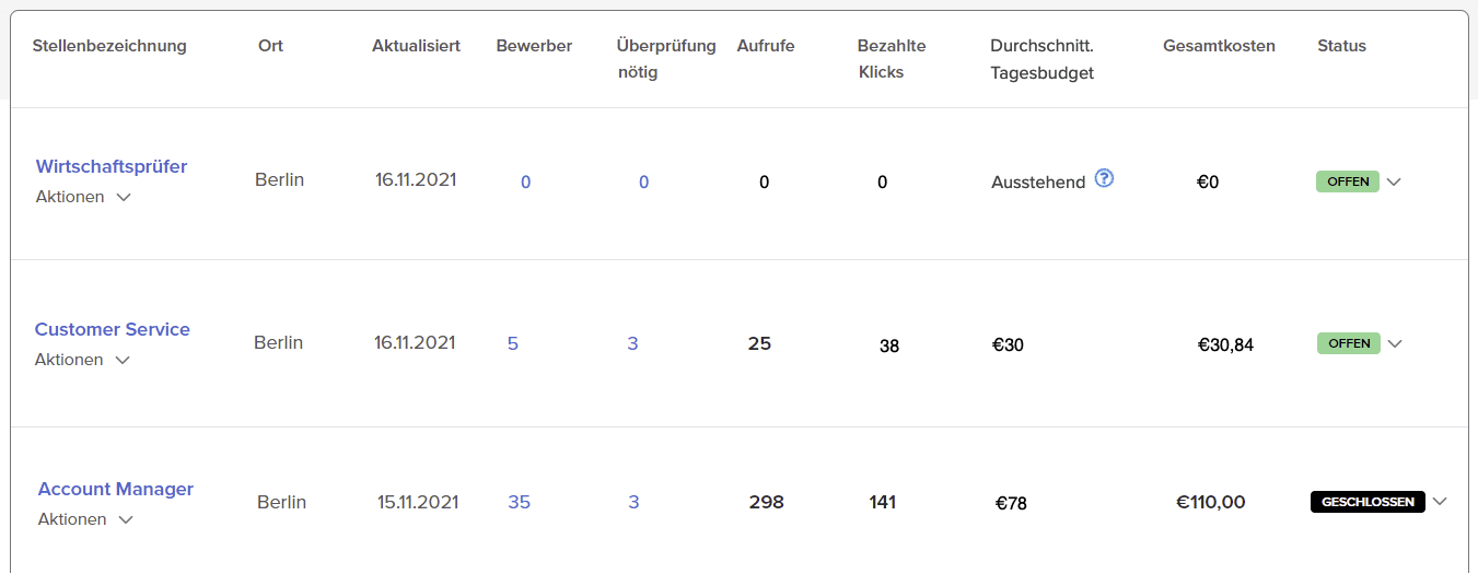 - Status – Zeigt Anzeigen nach deren Status an. Zum Beispiel: Entwurf, Offen, Geschlossen, Abgelaufen.