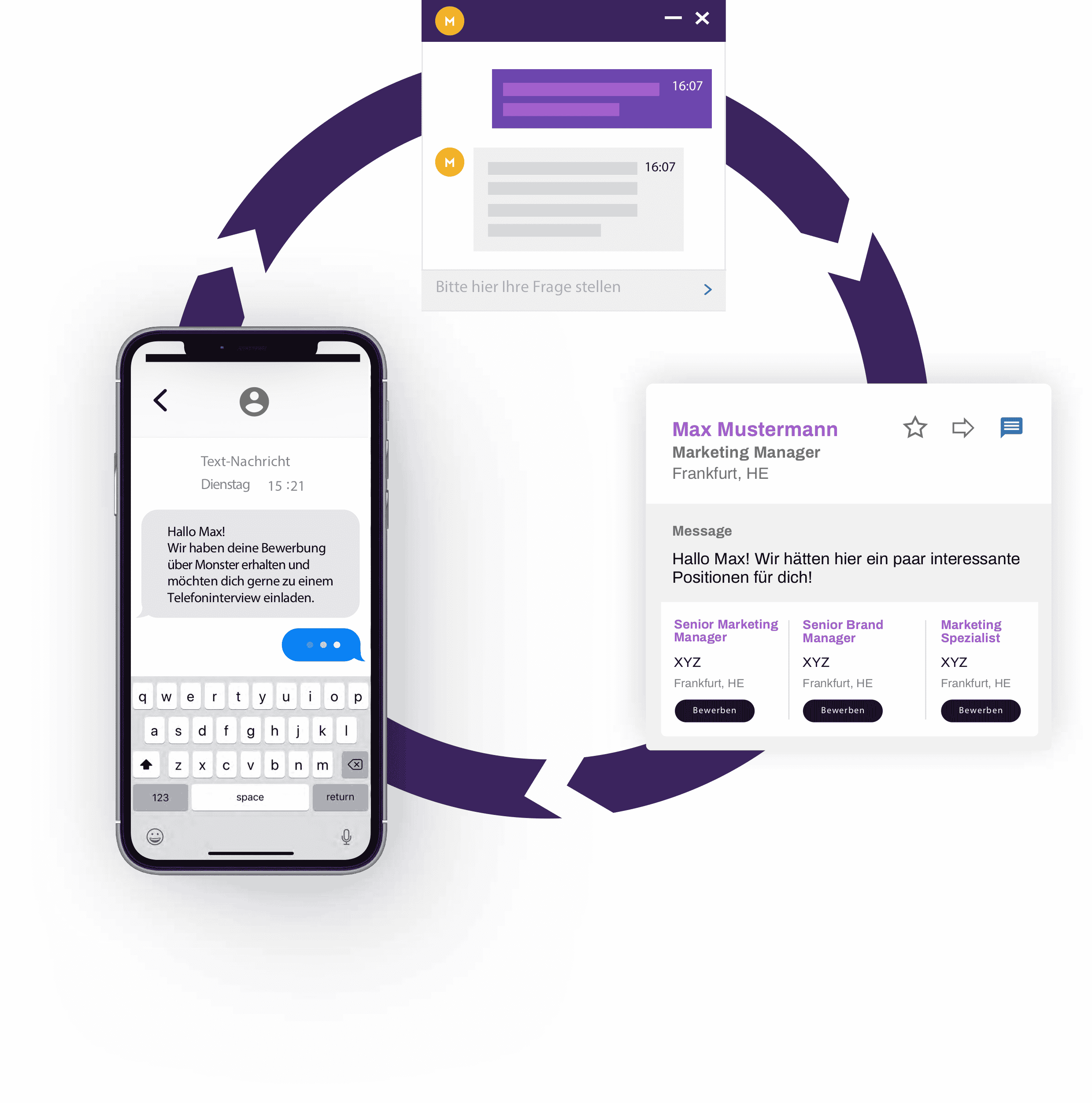 Unsere Kommunikationsplattform ermöglicht über den Erstkontakt hinaus eine stetige Kommunikation mit den Bewerbenden. So können Sie wiederkehrende Benachrichtigungen während des Bewerbungsprozesses automatisieren. Die Kandidat:innen sind stets über den aktuellen Stand ihrer Bewerbung informiert und Sie reduzieren somit die Absprungrate der Talente.